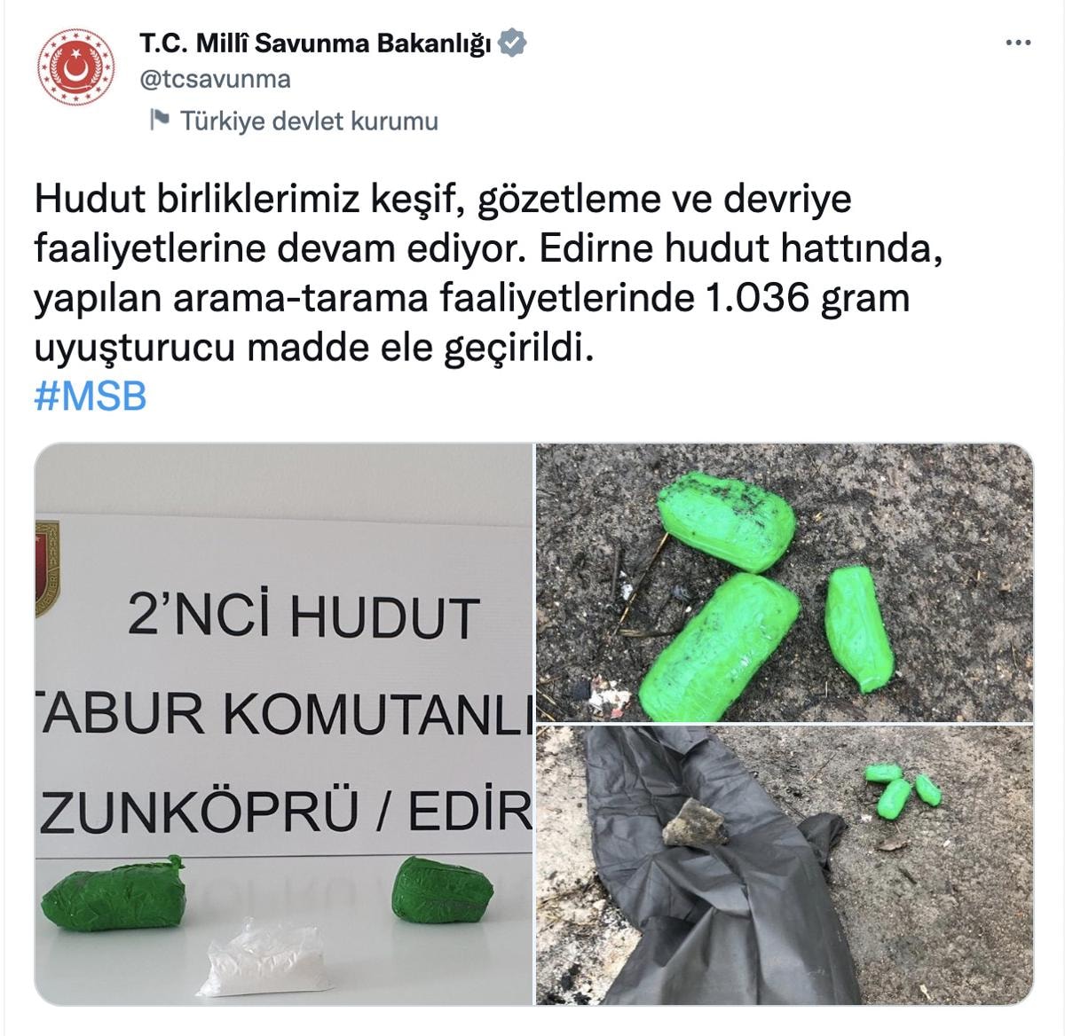 MSB'nin yaptığı açıklamada, "Hudut birliklerimiz keşif, gözetleme ve devriye faaliyetlerine devam ediyor. Edirne hudut hattında, yapılan arama-tarama faaliyetlerinde 1.036 gram uyuşturucu madde ele geçirildi." ifadeleri kullanıldı.