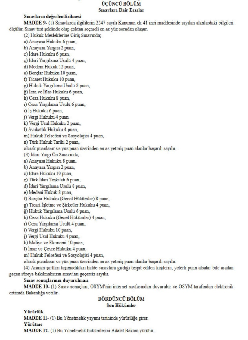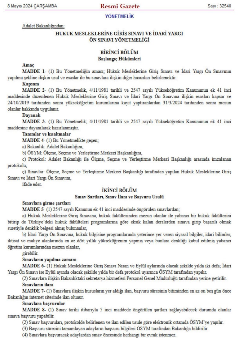 Hukuk Mesleklerine Giriş Sınavı ve İdari Yargı Ön Sınavı Yönetmeliği, Resmi Gazete'de yayınlanarak yürürlüğe girdi.