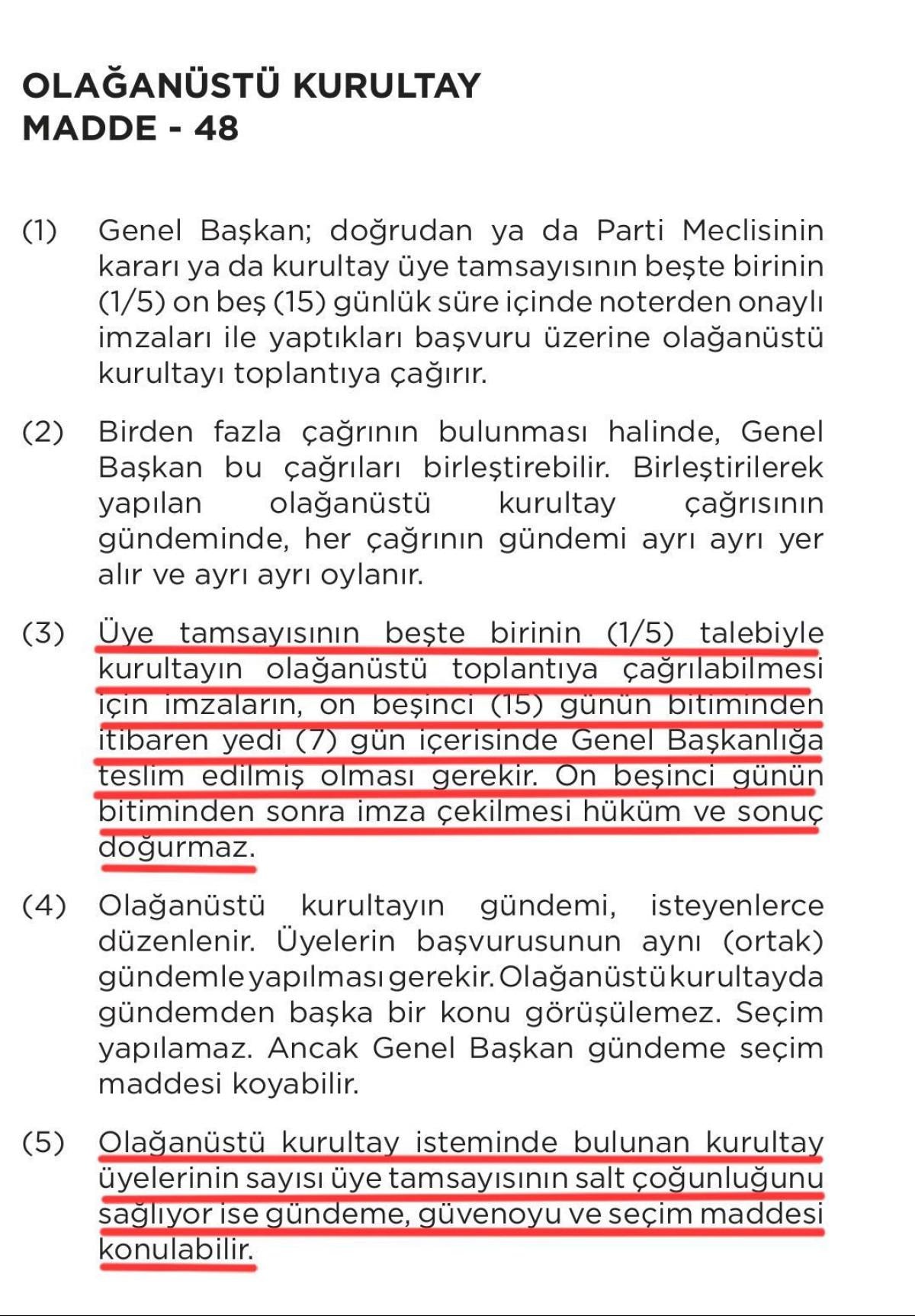 İmzaların 15. günün bitiminden itibaren 7 gün içerisinde Genel Başkanlığa teslim edilmesi gerekiyor. Yani imzalar erken toplansa bile hemen teslim edilemez, 15 günün dolması beklenmek zorunda" ifadelerini kullandı.