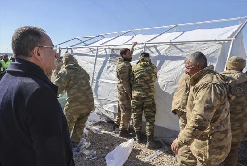 Hulusi Akar, saat 05.00 itibarıyla Genelkurmay Başkanı Orgeneral Güler ve Kuvvet Komutanlarından bilgi almasının ardından saat 05.10'da Cumhurbaşkanı Recep Tayyip Erdoğan'ı telefonla aradığını belirterek, "Bilgileri aldıktan sonra Sayın Cumhurbaşkanımızı arayarak Türk Silahlı Kuvvetleri ile ilgili ilk raporları sunduk. Aldığımız ilk bilgilere göre Hatay’da bir binamızın yıkılıp 3 erimizin şehit olduğu haberini kendilerine sunup Genelkurmay Başkanı ve Kara Kuvvetleri Komutanı ile Hatay’a hareket edeceğimizi kendilerine arz ettik. Uygun buldular ve bu çerçevede çalışmalarımızı sürdürdük." açıklamasında bulundu.