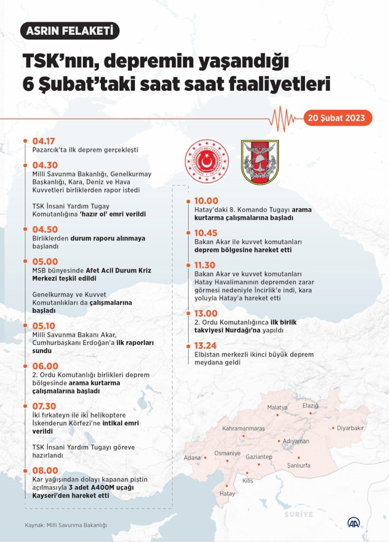 Merkez üssü Kahramanmaraş'ın Pazarcık ilçesi olan ilk deprem saat 04.17'de gerçekleşti. Milli Savunma Bakanlığının yanı sıra Genelkurmay, Kara, Deniz ve Hava Kuvvetlerinin harekat merkezleri süratle yapılması gerekenleri yaparak saat 04.30’da birliklerden rapor istedi. Aynı saatte Türk Silahlı Kuvvetleri İnsani Yardım Tugay Komutanlığına 'hazır ol' emri verildi. Saat 04.50'de 2. Ordu Komutanı Orgeneral Metin Gürak görevinin başındaydı ve birliklerden durum raporu almaya başladı. Saat 05.00'te Bakanlığımız bünyesinde Afet Acil Durum Kriz Merkezi teşkil edildi. Eş zamanlı olarak kriz merkezleri Genelkurmay ve Kuvvet Komutanlıklarında da çalışmaya başladı.
