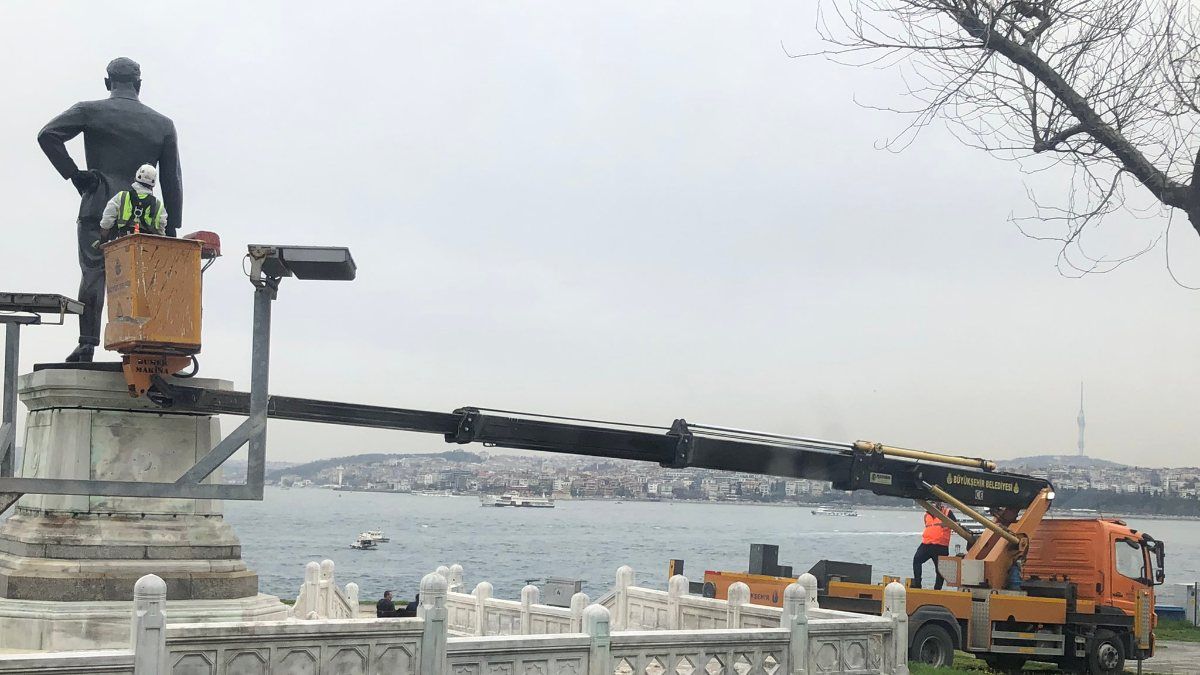 Belli aralıklarla düzenli olarak temizlenen anıtın arka kısmı ise bugün vinç yardımıyla bir kez daha kontrol edildi.