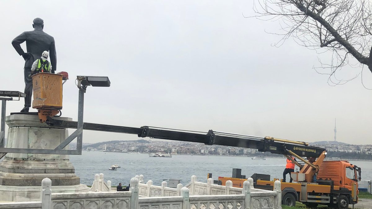 İBB'nin özel heykel ekibi tarafından yapılan çalışmalar sonucu bronz döküm olan heykel üzerindeki atık ve kirler temizlendi.