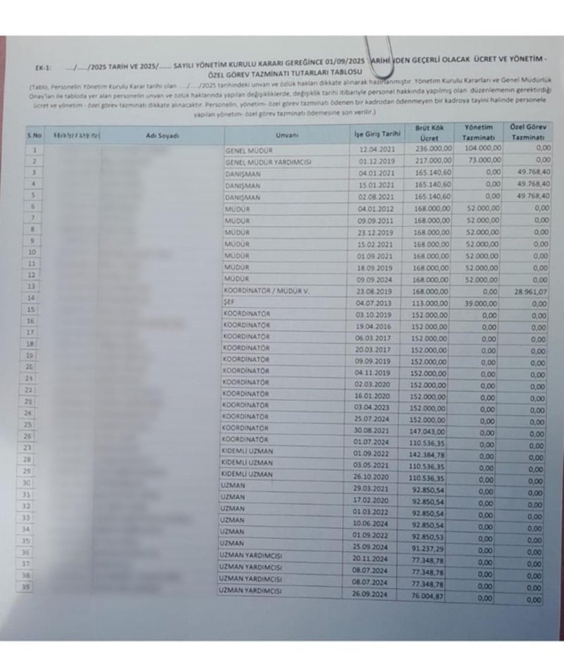 Müdürden uzman yardımcısına kadar toplam 39 personelden oluşan yönetim kadrosunun maaş listesindeki meblağlar dikkat çekti.