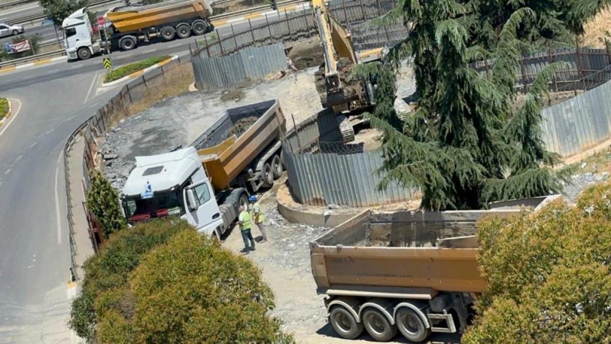 Hattın Sultanbeyli bölümünden paylaşılan fotoğrafta, İBB ekiplerinin, metronun şaft tünelini hafriyat kamyonlarıyla moloz dökülerek kapattığı görüldü.
