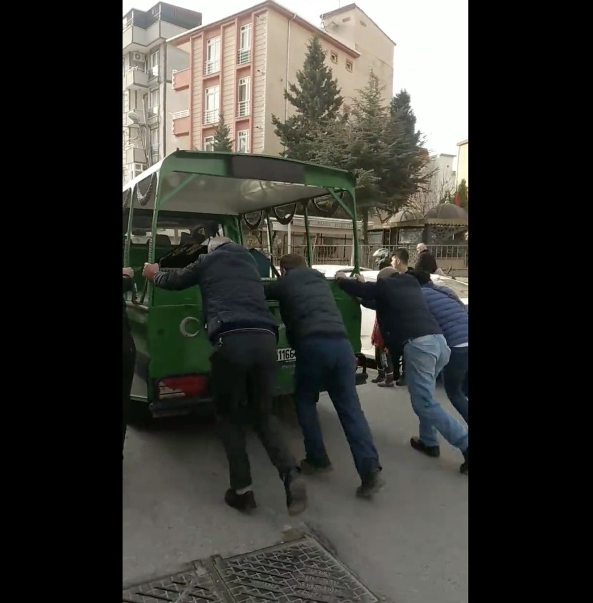 Cenazeyi yetiştirmek isteyen vatandaşlar çözümü aracı itmekte buldu.