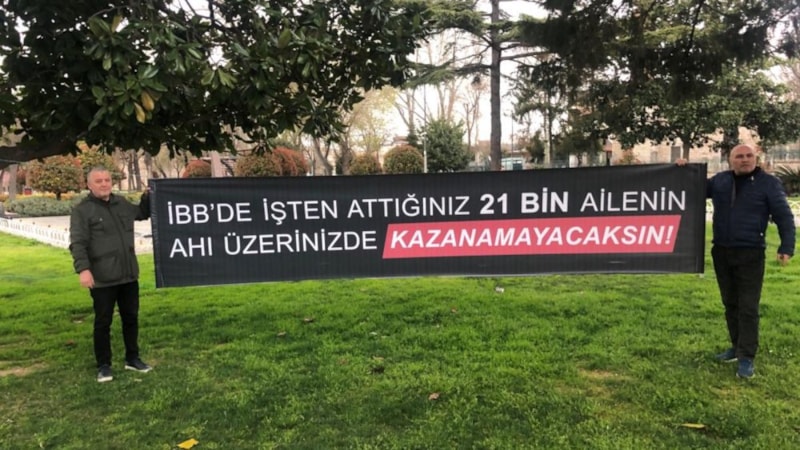 İstanbul Büyükşehir Belediyesi tarafından, sosyal medya hesaplarında Cumhurbaşkanı Erdoğan'ı paylaştıkları için işten çıkarılan işçiler, “İBB’de işten attığınız 21 bin ailenin ahı üzerinizde, kazanamayacaksın” yazılı pankartla eylem yaptı.