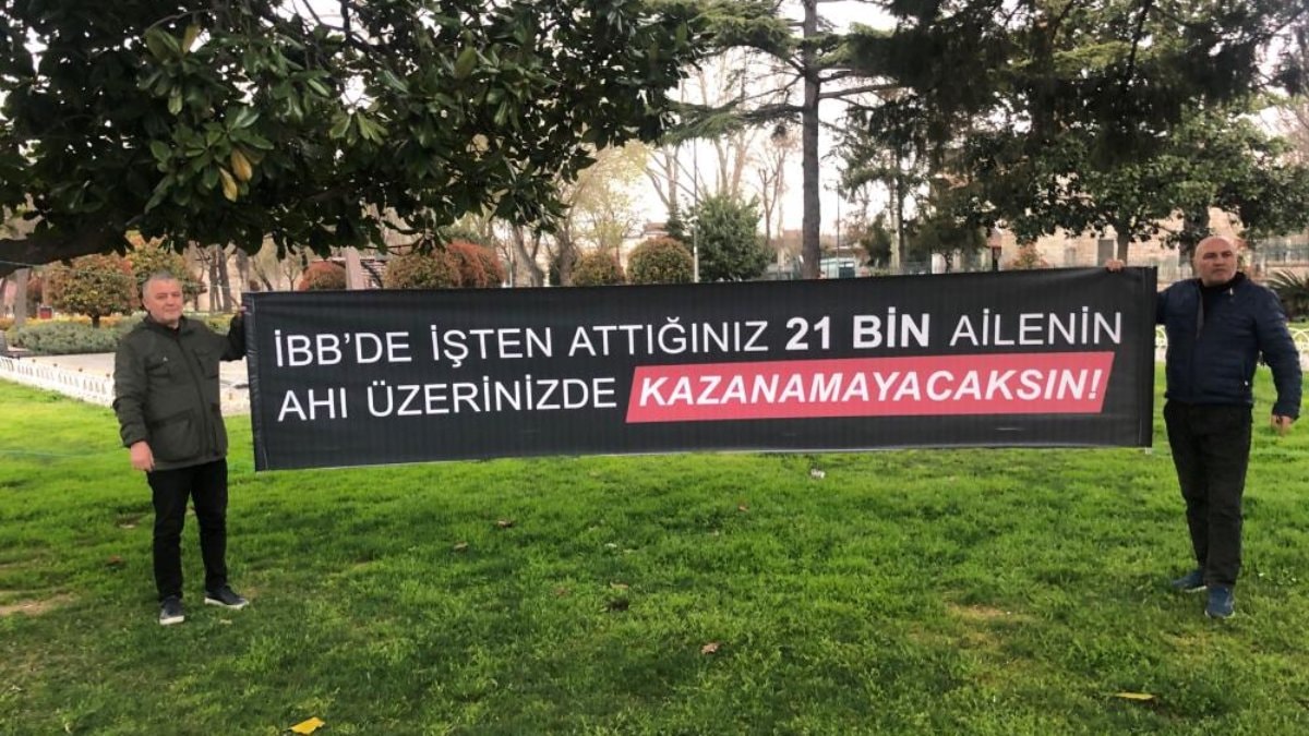 Toplamda 21 bin işçinin işten çıkarıldığı iddiası üzerine işçiler, “İBB’de işten attığınız 21 bin ailenin ahı üzerinizde, kazanamayacaksın” pankartı açarak seçime bir hafta kala duruma tepki gösterdi.