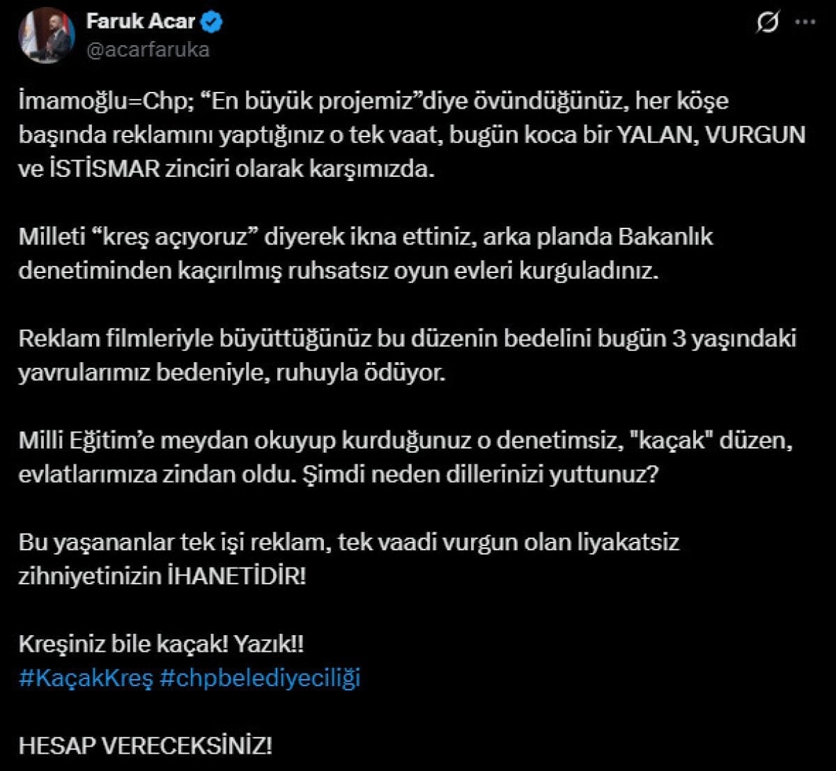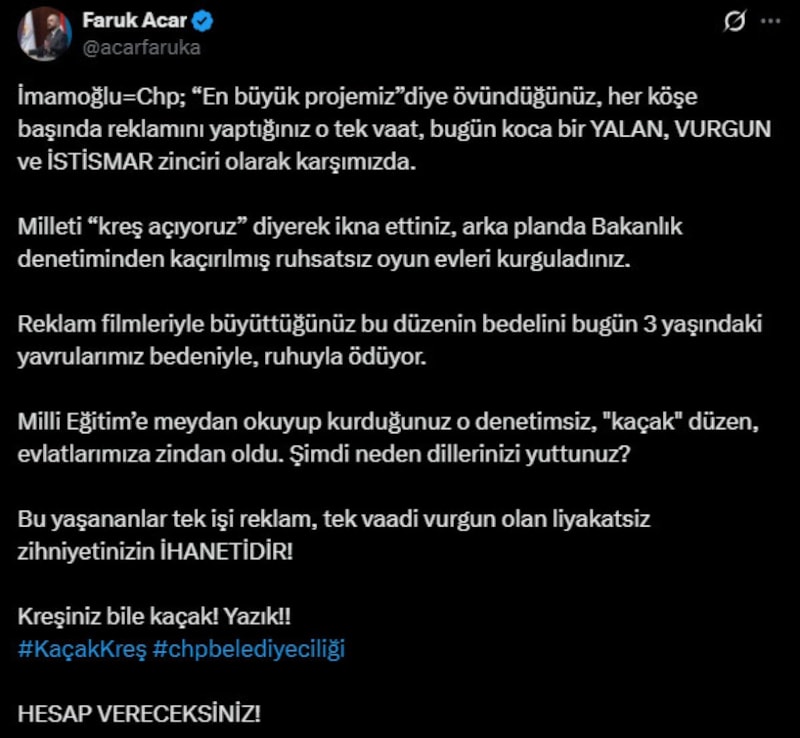 "Bu yaşananlar tek işi reklam, tek vaadi vurgun olan liyakatsiz zihniyetinizin ihanetidir. Hesap vereceksiniz" ifadelerini kullanan Acar'ın paylaşımı şu şekilde: