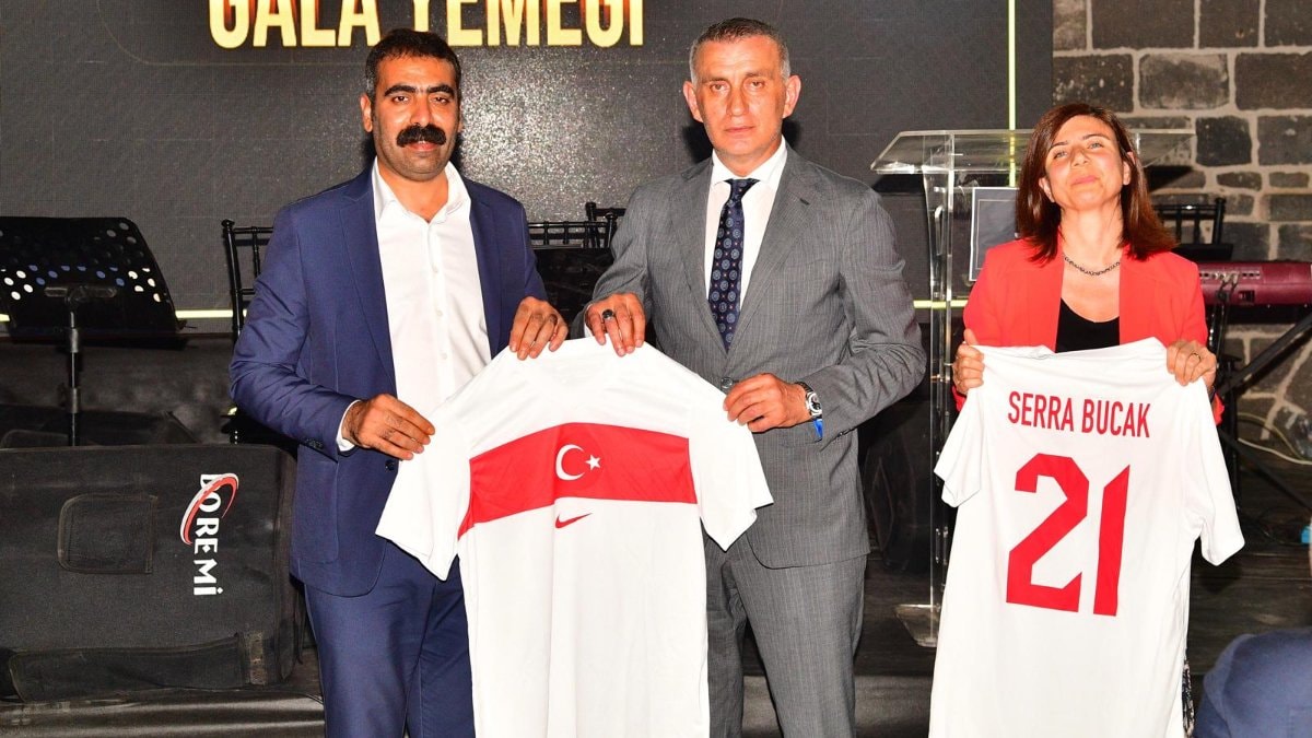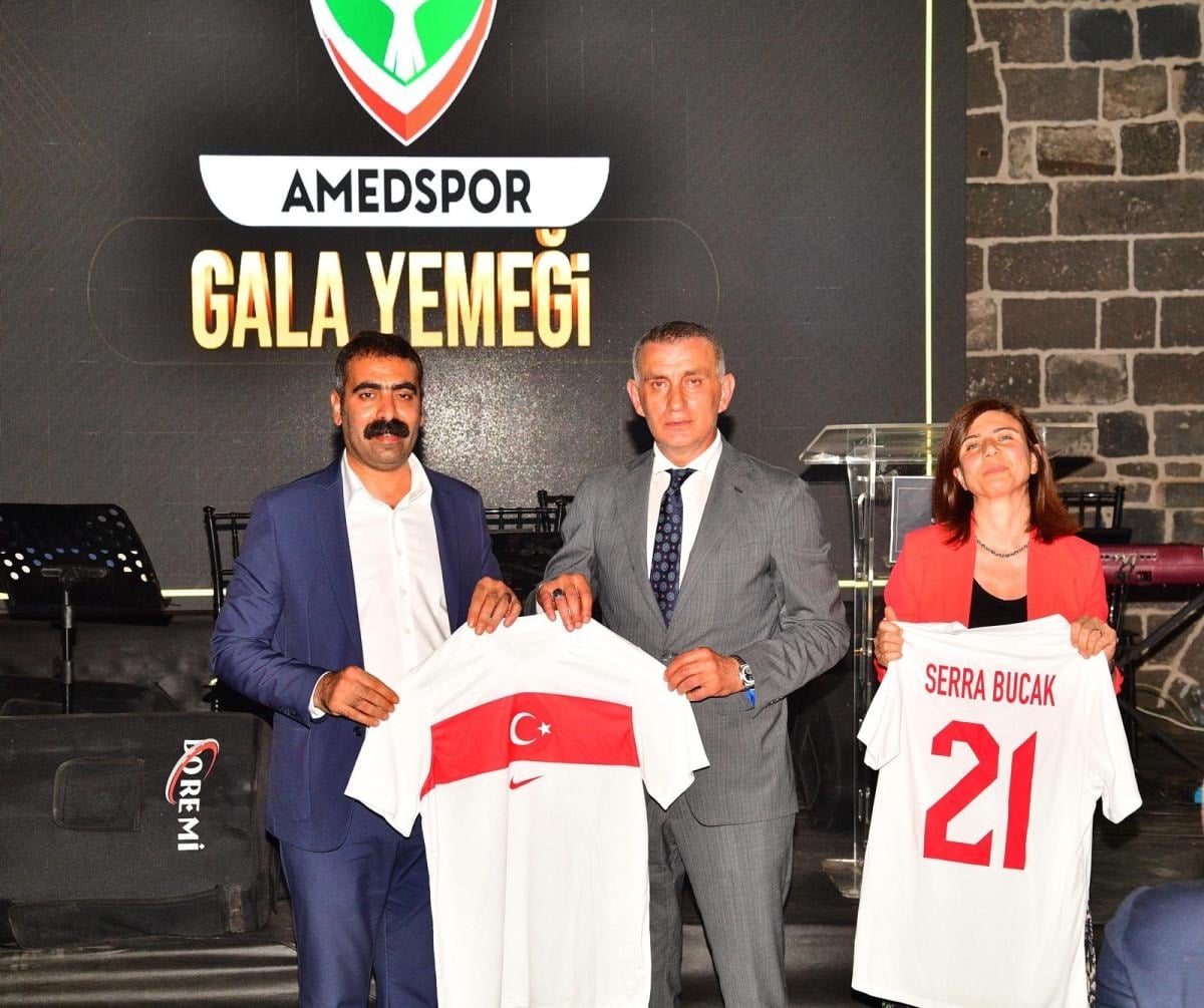 Ayrıca Hacıosmanoğlu, katıldığı gala yemeğinde DEM Partili Diyarbakır Belediye Başkanı Serra Bucak'a ve Doğan Hatun'a A Milli Takım forması hediye etti.