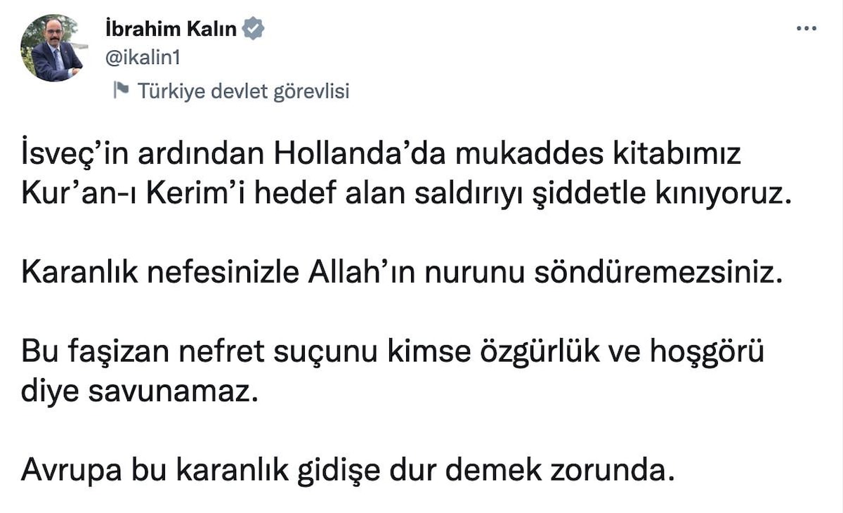 "İsveç’in ardından Hollanda’da mukaddes kitabımız Kur’an-ı Kerim’i hedef alan saldırıyı şiddetle kınıyoruz. Karanlık nefesinizle Allah’ın nurunu söndüremezsiniz. Bu faşizan nefret suçunu kimse özgürlük ve hoşgörü diye savunamaz. Avrupa bu karanlık gidişe dur demek zorunda."