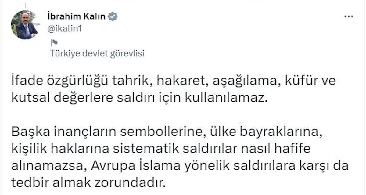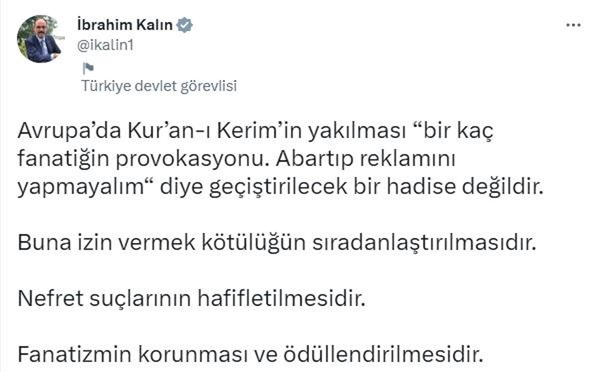 Cumhurbaşkanlığı Sözcüsü İbrahim Kalın, İsveç ve Hollanda'da Kur'an-ı Kerim'i hedef alan saldırılara ilişkin sosyal medya hesabından paylaşımda bulundu.