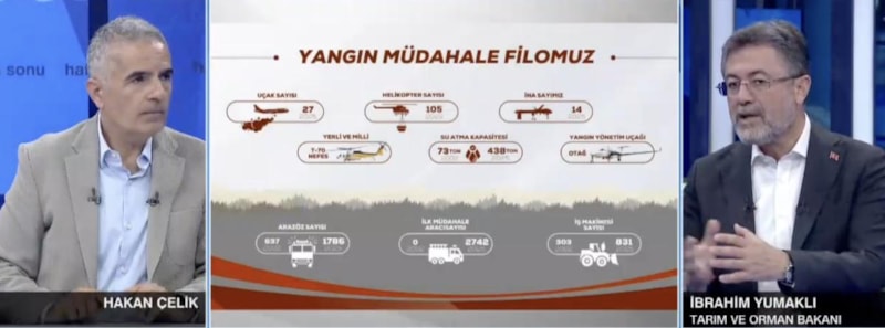 Yumaklı, Hakan Çelik’in sorularını yanıtlarken orman yangınlarındaki son durum ve müdahale için yapılan faaliyetlerle ilgili bilgi vererek, "Bu hafta bu ay çok riskli 15 Ekim 2025’e kadar çok riskli. Daha fazla dikkat edilmesi gerekiyor." dedi.