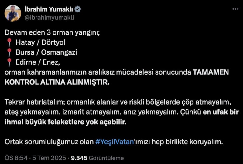 Hatay Dörtyol, Bursa Osmangazi, Edirne Enez orman yangınlarının, ekiplerin aralıksız mücadelesi sonucunda tamamen kontrol altına alındığını duyuran Bakan Yumaklı, "Ortak sorumluluğumuz olan yeşil vatanımızı hep birlikte koruyalım." dedi.