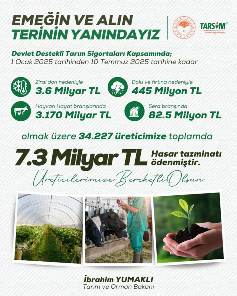 Paylaşımda yer alan bilgilere göre, devlet destekli tarım sigortaları kapsamında, 1 Ocak-10 Temmuz döneminde, zirai don nedeniyle 3,6 milyar lira, dolu ve fırtına dolayısıyla 445 milyon lira, hayvan hayat branşlarında 3 milyar 170 milyon lira, sera branşında 82,5 milyon lira olmak üzere 34 bin 227 üreticiye 7,3 milyar lira hasar tazminatı ödendi.