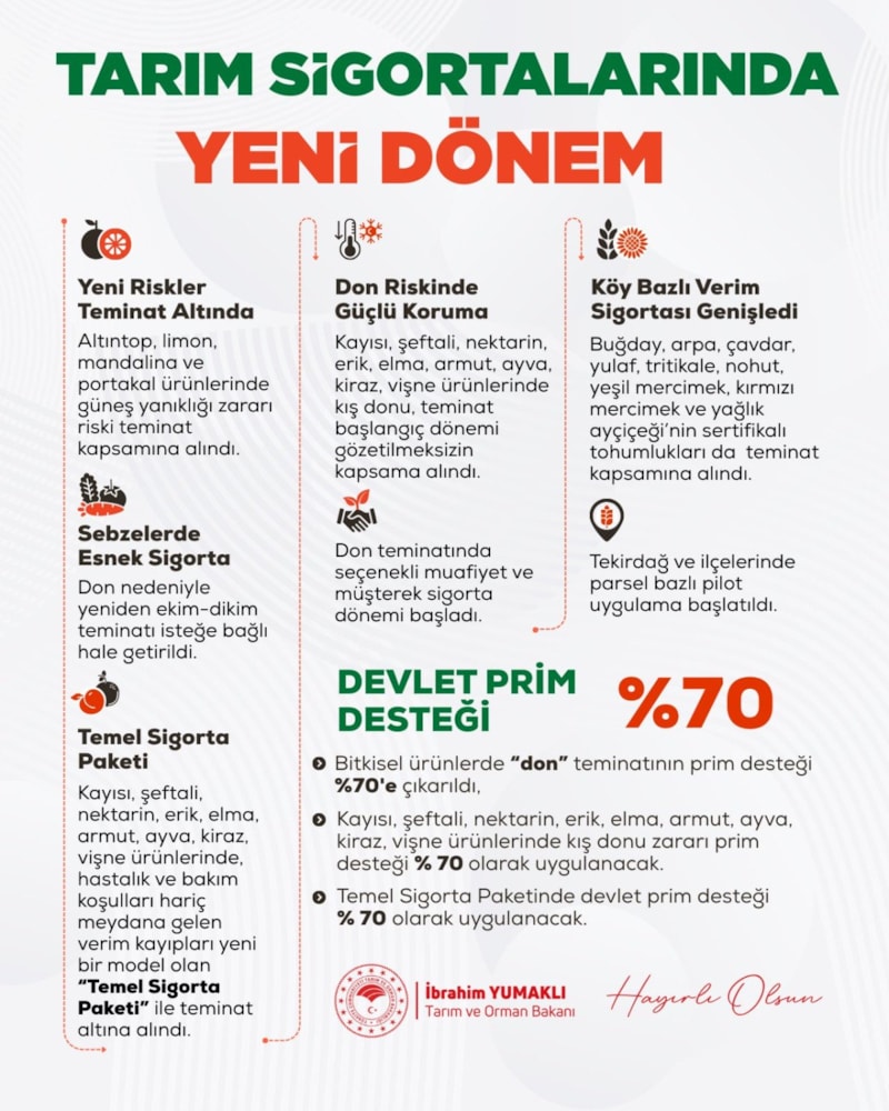 Kararda yer alan yeni unsurlara dikkati çeken Yumaklı, "Meyve ve sebzelerde don riskine karşı kapsamı genişletiyoruz. Hububat ve bakliyatta Köy Bazlı Verim Sigortası'nı sertifikalı tohumlukları da kapsayacak şekilde güçlendiriyoruz." bilgisini paylaştı.