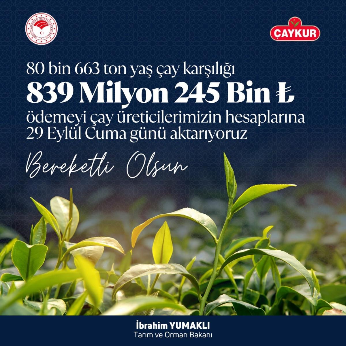 Tarım Bakanı Yumaklı, sosyal medya hesabından yaptığı paylaşımda, "ÇAYKUR aracılığıyla, 80 bin 663 ton yaş çay alımı karşılığı 839 milyon 245 bin TL ödemeyi çay üreticilerimizin hesaplarına 29 Eylül Cuma(yarın) günü aktarıyoruz. Hayırlı ve bereketli olsun." ifadelerini kullandı.