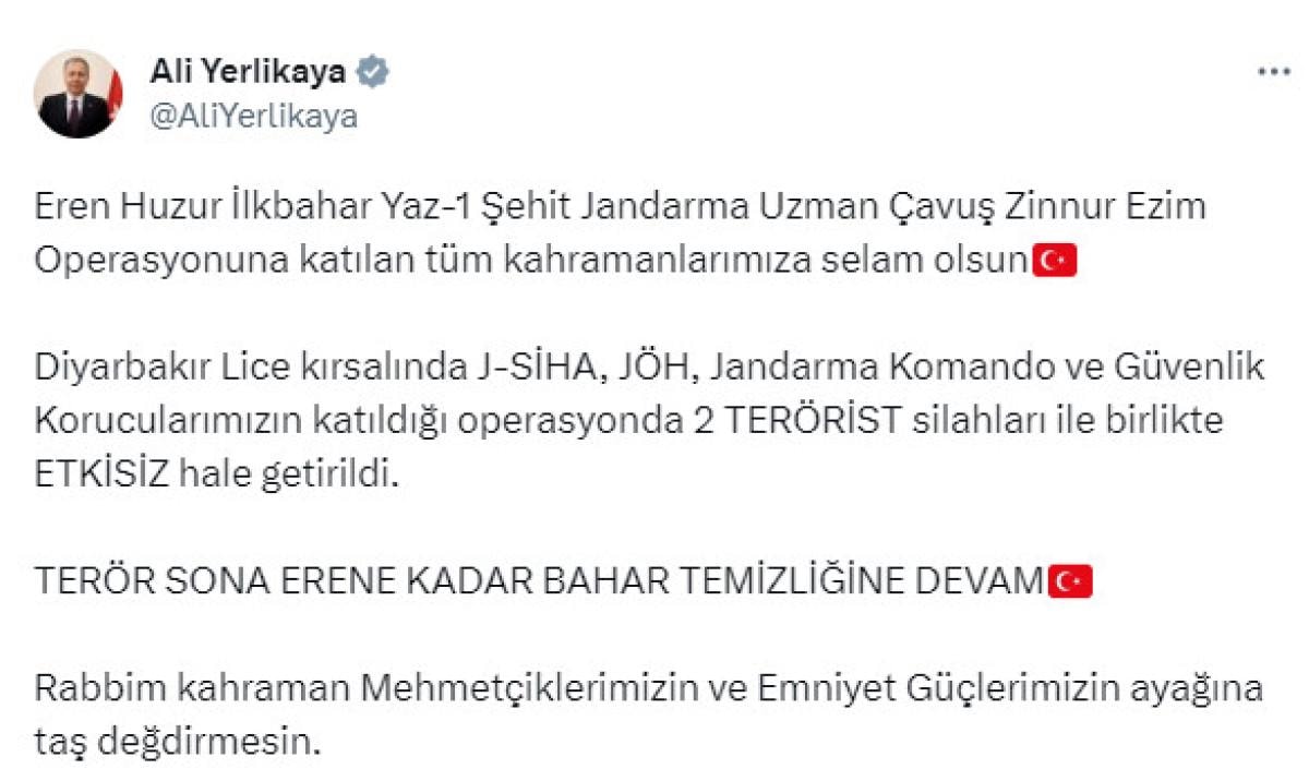 Konuya ilişkin açıklama, İçişleri Bakanı Ali Yerlikaya'dan geldi. Yerlikaya, sosyal medya hesabından yaptığı paylaşımda terörle mücadele vurgusu da yaptı.
