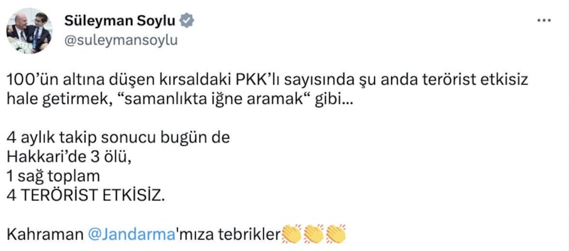 Bakan Soylu, Hakkari kırsalında takibi yapılan 4 teröristin etkisiz hale getirildiğini duyurdu.