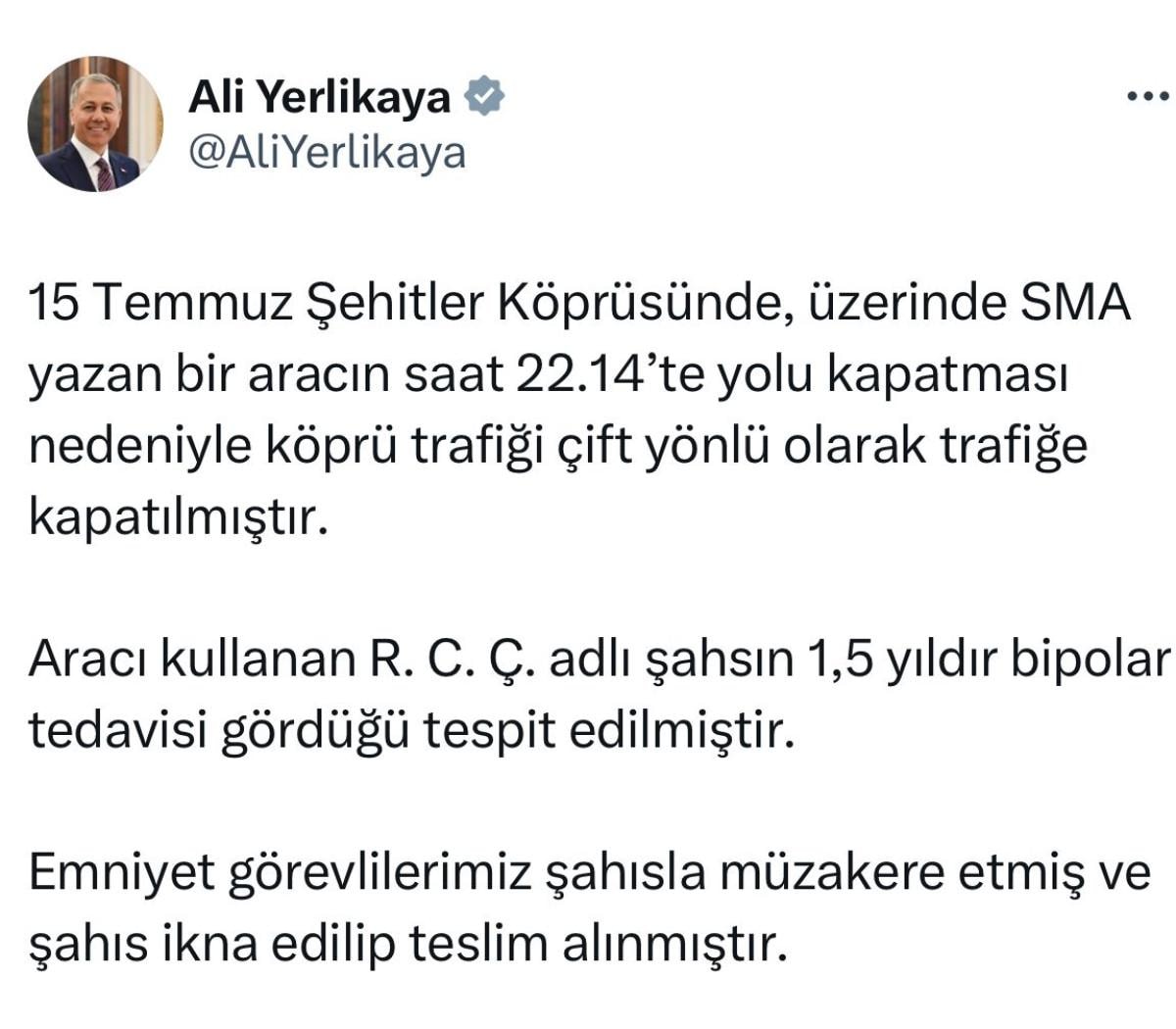 15 Temmuz Şehitler Köprüsü'nde, üzerinde SMA yazan bir aracın saat 22.14'te yolu kapatması nedeniyle köprü trafiğinin çift yönlü olarak trafiğe kapatıldığını belirtti.