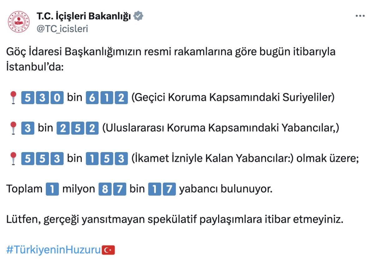 İçişleri Bakanlığı'nın sosyal medya hesabından yapılan paylaşımda, İstanbul'da bulunan yabancı sayısına ilişkin şu ifadelere yer verildi;