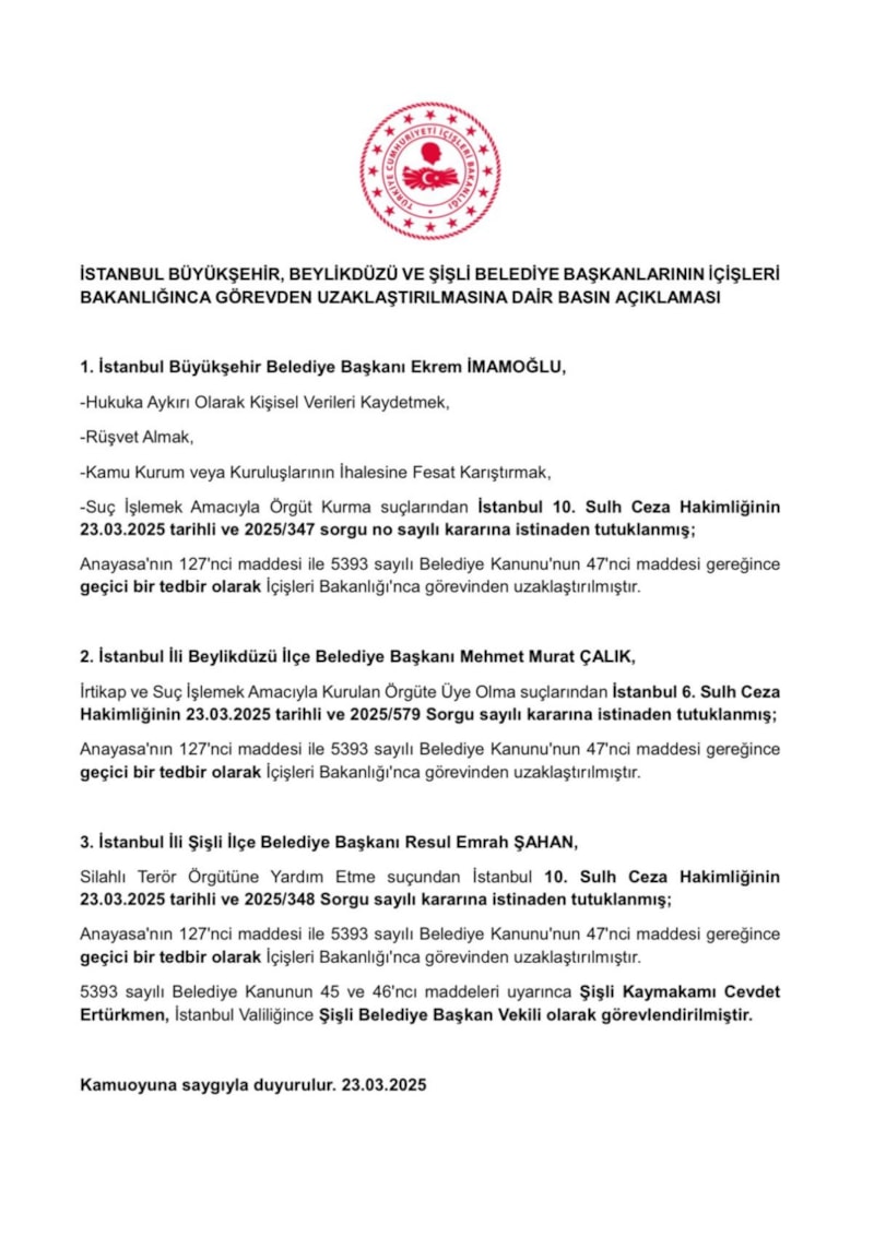 İstanbul Büyükşehir Belediyesi Başkanı Ekrem İmamoğlu ve Beylikdüzü Belediye Başkanı Mehmet Murat Çalık’ın İçişleri Bakanlığı tarafından geçici bir tedbir olarak görevlerinden uzaklaştırılmaları nedeniyle;
