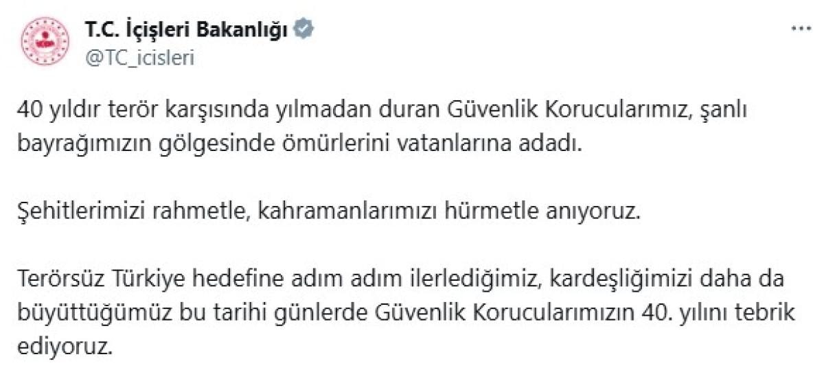 İçişleri Bakanlığı'nın sosyal medya hesabından yayımlanan mesajda, şu ifadelere yer verildi: