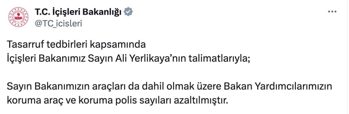 Bakanlığın sosyal medya hesabından yapılan açıklamada, "Tasarruf tedbirleri kapsamında İçişleri Bakanımız Sayın Ali Yerlikaya'nın talimatlarıyla, Sayın Bakanımızın araçları da dahil olmak üzere Bakan Yardımcılarımızın koruma araç ve koruma polis sayıları azaltılmıştır." ifadelerine yer verildi.