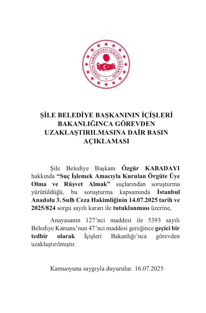 Şile Belediye Başkanı Özgür Kabadayı hakkında 'Suç İşlemek Amacıyla Kurulan Örgüte Üye Olma ve Rüşvet Almak' suçlarından soruşturma yürütüldüğü, bu soruşturma kapsamında İstanbul Anadolu 3. Sulh Ceza Hakimliğinin 14.07.2025 tarih ve 2025/824 sorgu sayılı kararı ile tutuklanması üzerine, Anayasa'nın 127'nci maddesi ile 5393 sayılı Belediye Kanunu'nun 47'nci maddesi gereğince geçici bir tedbir olarak İçişleri Bakanlığı'nca görevden uzaklaştırılmıştır.