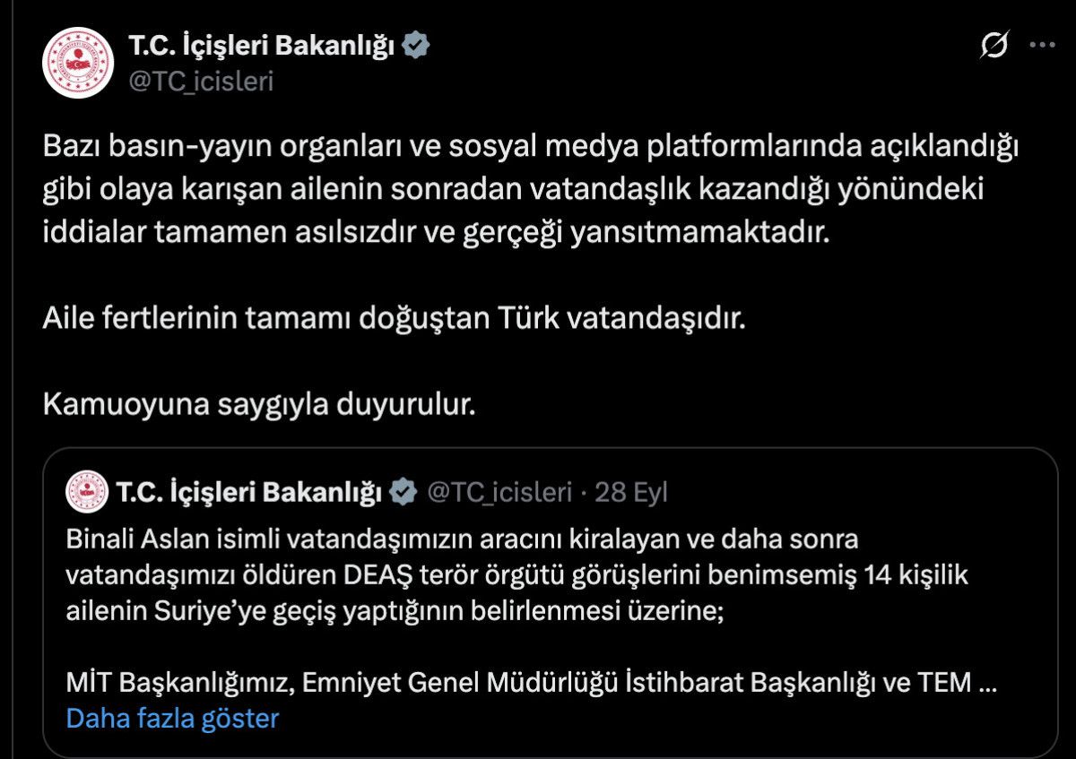 Bazı basın-yayın organları ve sosyal medya platformlarında açıklandığı gibi olaya karışan ailenin sonradan vatandaşlık kazandığı yönündeki iddialar tamamen asılsızdır ve gerçeği yansıtmamaktadır. Aile fertlerinin tamamı doğuştan Türk vatandaşıdır.