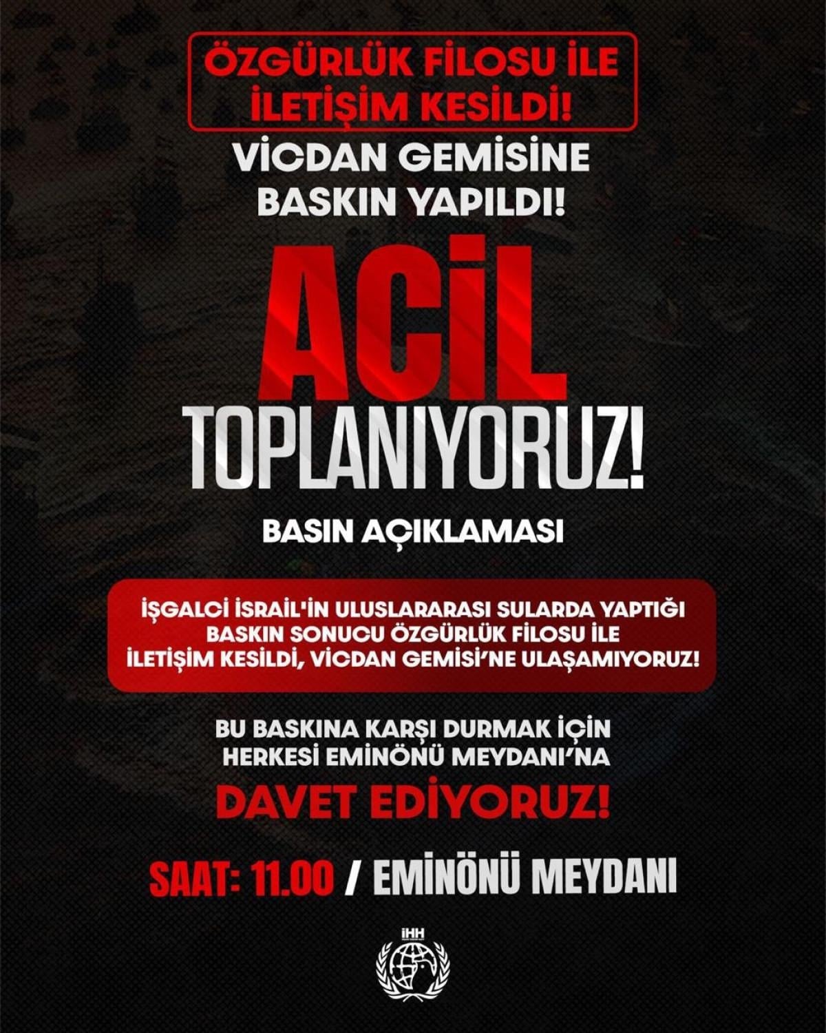 Açıklama için duyurular yapılırken tüm vatandaşlardan Gazze halkına ve aktivistlere destek için katılım çağrısında bulunuldu.