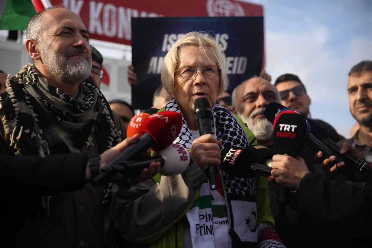 Gazze Özgürlük Filosu Organizatörü Ann Wright, "Ben burada 10 ülkenin oluşturduğu Uluslararası Gazze’yi Özgürleştirme ve Blokajı Kaldırma Komitesi’nin toplantısı için bulunuyorum. Bugün Amerika’dan, Kanada’dan, İsveç’ten, Norveç’ten, Malezya’dan, Güney Afrika gibi ülkelerden delegasyonlarla birlikteyiz. 2024’te Gazze’deki ablukayı kaldırmak için tekrar bir gemi hazırladığımızı buradan belirtmek istiyorum. Böyle bir konvoy organize ettiğiniz içinde hepinize teşekkür ediyoruz." sözlerini söyledi.