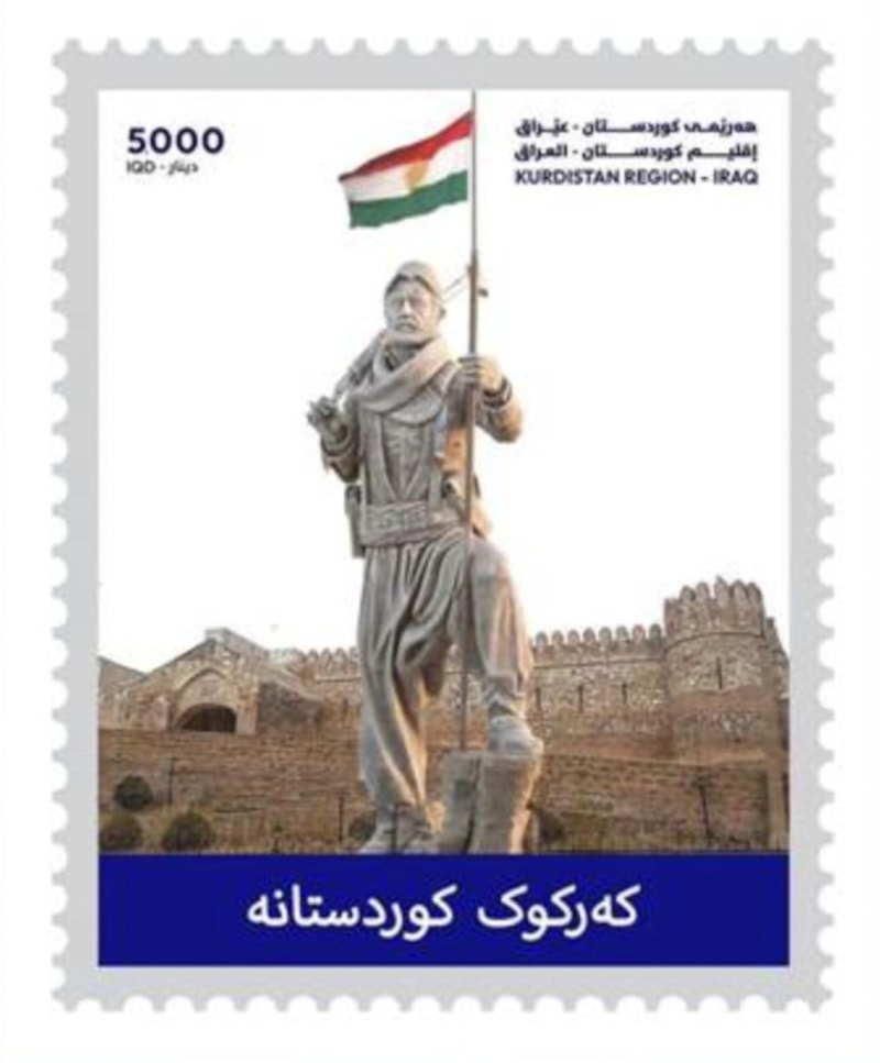 Yönetim, üzerinde 'Kerkük Kürdistan'dır' yazılı peşmerge heykelini posta pulu yaptı.