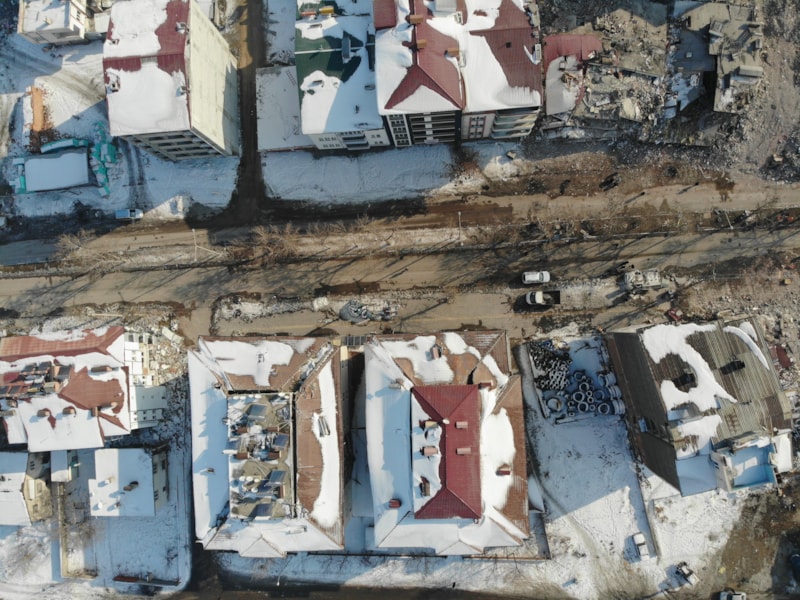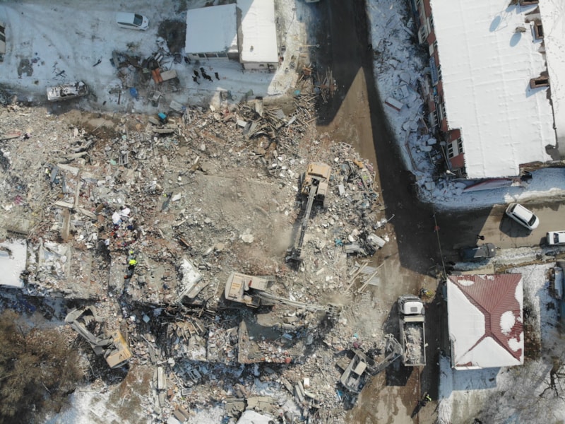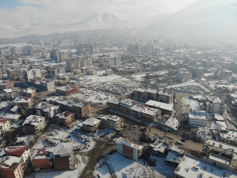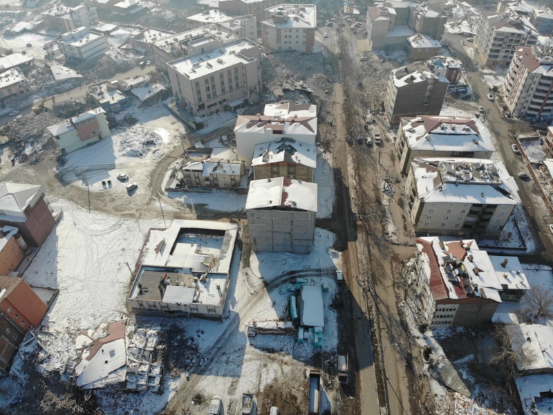 İlçe merkezinde bulunan ve çoğu 5 katlı olan binaların tamamına yakını çökerken, depremin yerle bir ettiği ilçe havadan görüntülendi.