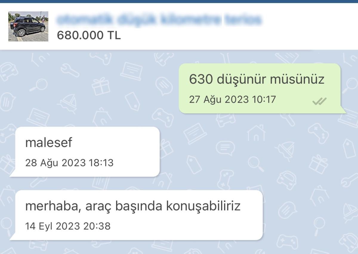 Gündem olan görüntüde, bir online ilan sitesinde alıcının indirim talebine satıcı ilk etapta olumsuz cevap verirken yaklaşık 15 gün sonra geri dönüş yaparak indirim teklifini yeniden görüşmeyi teklif ediyor.