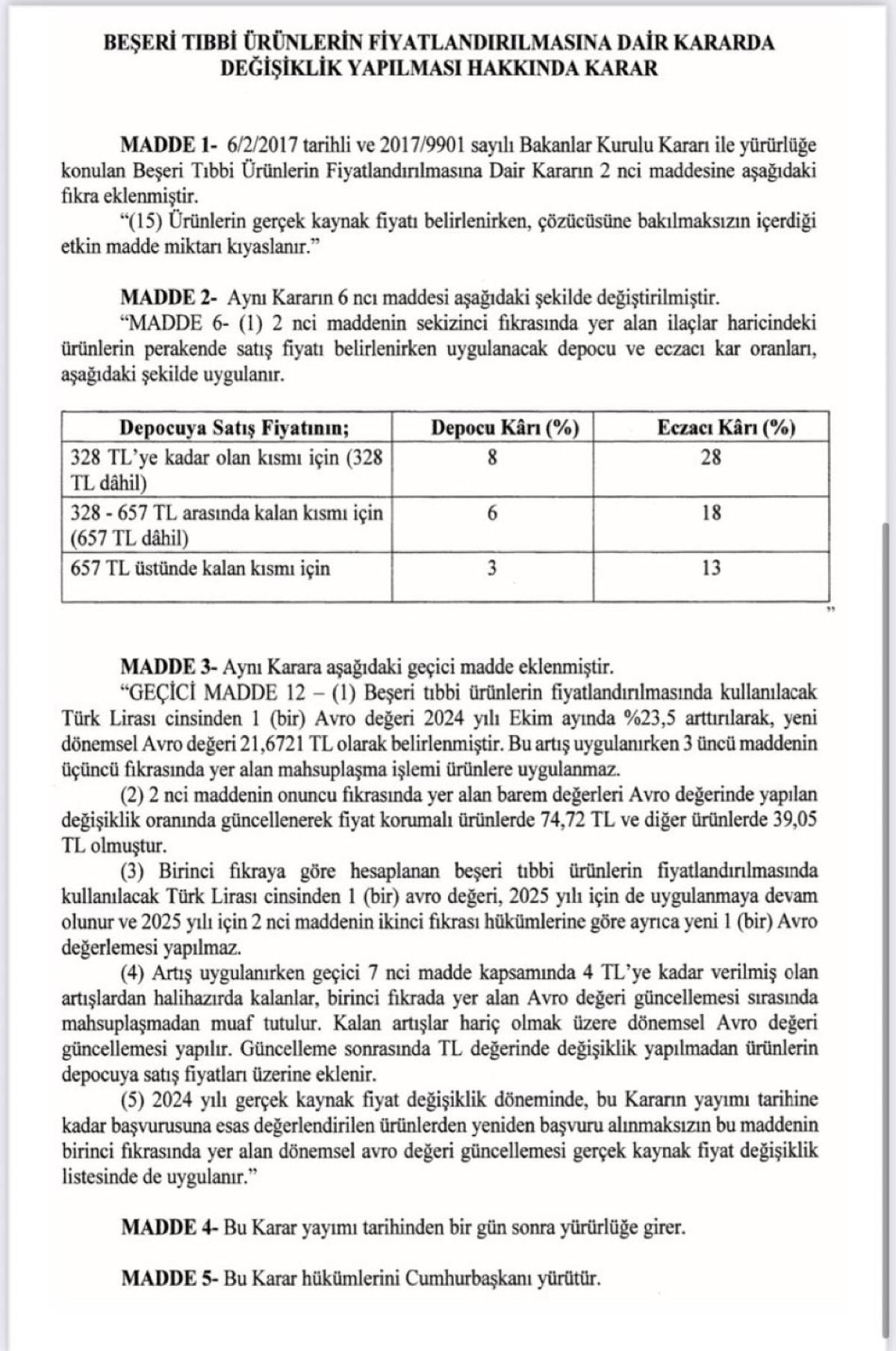 Resmi Gazete'de yayınlanan beşeri tıbbi ürünlerin fiyatlandırılmasına dair kararda değişiklik yapılması hakkında Cumhurbaşkanı kararına göre, belirlenen euro değeri 2025 yılı için de uygulanmaya devam edilecek. 2025 yılı için yeni bir euro değerlemesi yapılmayacak.