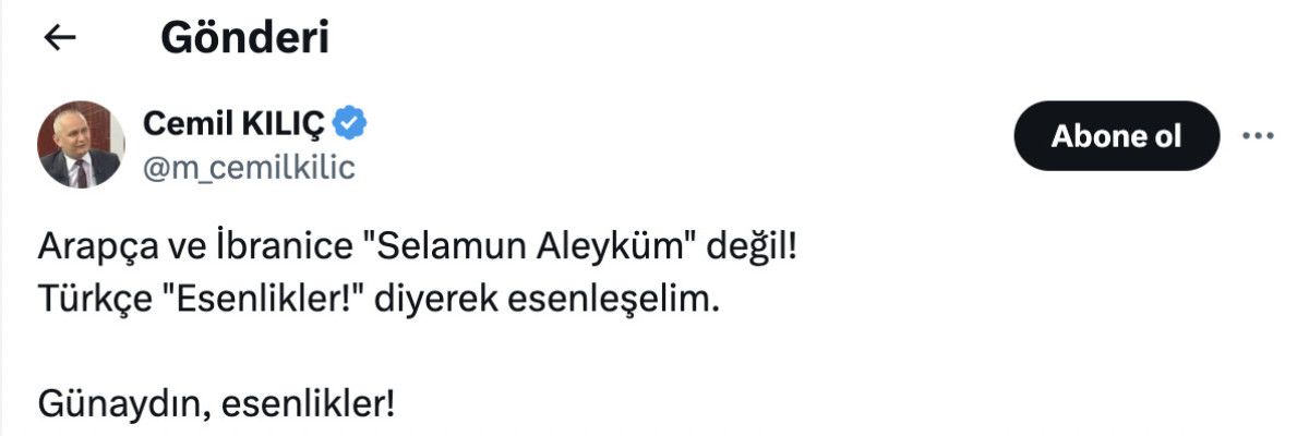 Sabah saatlerinde paylaşım yapan Kılıç, "Arapça ve İbranice "Selamun Aleyküm" değil!" dedi ve nasıl selamlaşılması gerektiğini söyledi.