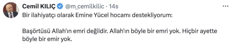"Bir ilahiyatçı olarak Emine Yücel Hocamı destekliyorum: Başörtüsü Allah'ın emri değildir. Allah'ın böyle bir emri yok. Hiçbir ayette böyle bir emir yok."