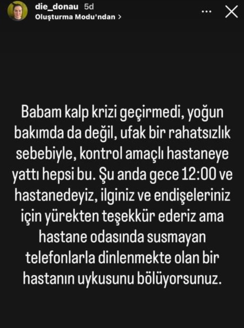 Tuna Ortaylı Kazıcı, babasının ufak bir rahatsızlık sebebiyle kontrol amaçlı hastaneye yattığını ancak kalp krizi geçirmediğini belirterek, "İlginiz ve endişeleriniz için yürekten teşekkür ederiz ama hastane odasında susmayan telefonlarla dinlenmekte olan bir hastanın uykusunu bölüyorsunuz" ifadelerini kullandı.