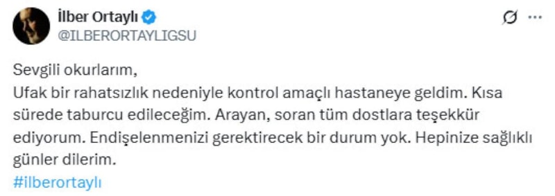 Sosyal medya hesabından paylaşım yapan İlber Ortaylı da geçirdiği rahatsızlık nedeniyle hastaneye gittiğini belirterek şunları söyledi: