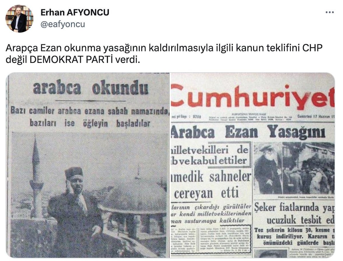 Türkçe ezandan tekrar Arapça ezana dönülmesi için verilen kanun teklifi, Demokrat Parti’nin değil CHP’nindir. Öbürü onu devam ettirmiştir