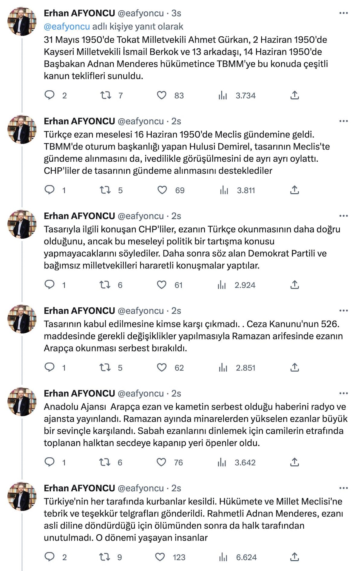 Afyoncu, İlber Ortaylı'nın aksine Arapça ezan okunma yasağının kaldırılmasıyla ilgili kanun teklifini CHP'nin değil Demokrat Parti'nin verdiğini söyledi.