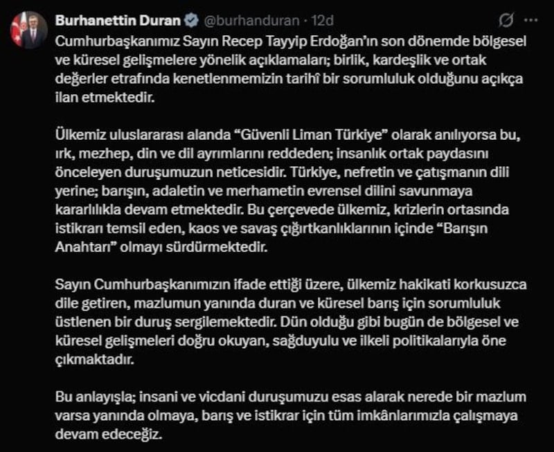 Açıklamasında Türkiye’nin, çatışma ve nefret diline karşı barış, adalet ve merhamet temelli bir duruş sergilediğini belirten Duran, ülkenin kriz ortamlarında istikrarı temsil ettiğini ve “barışın anahtarı” olma rolünü sürdürdüğünü kaydetti.