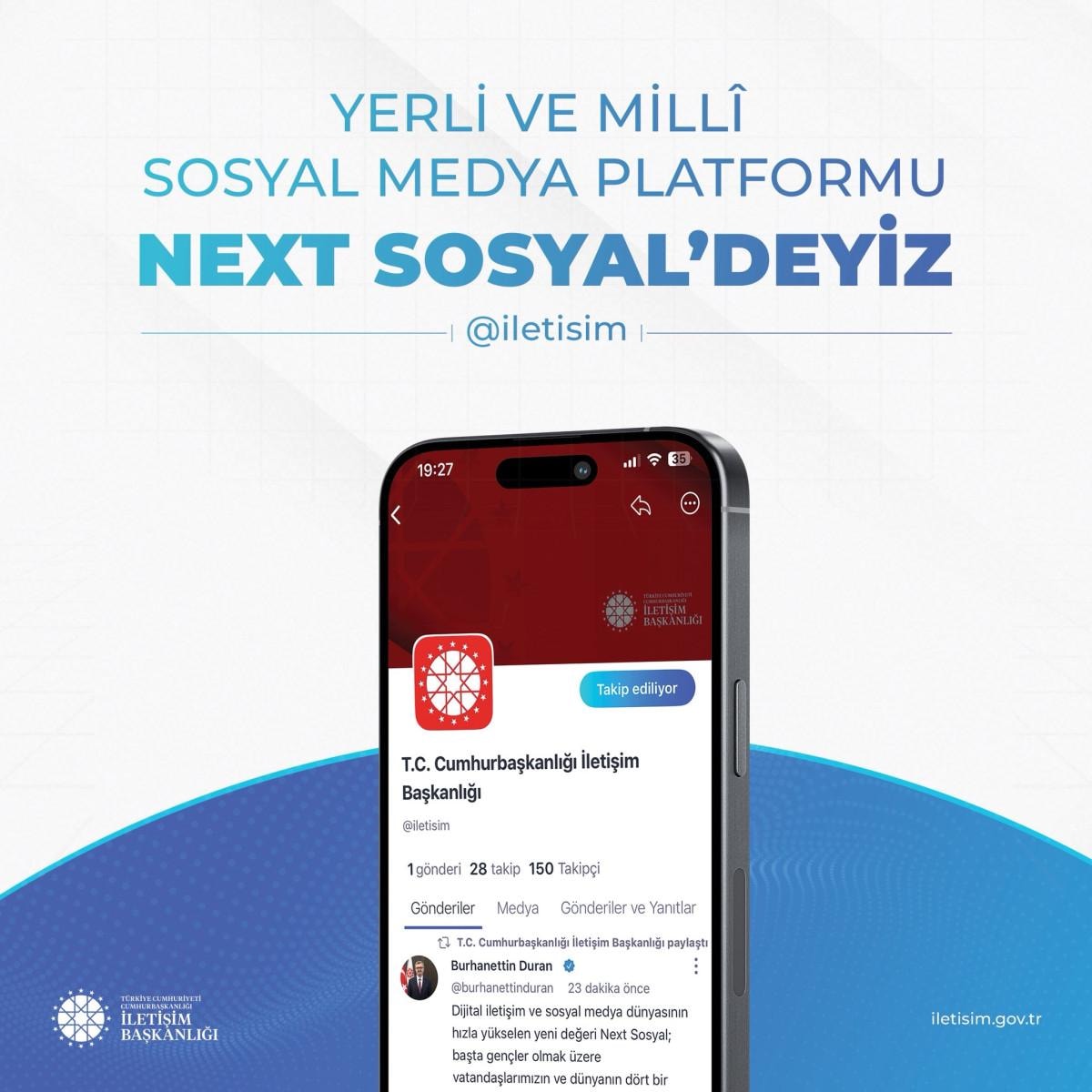 Cumhurbaşkanlığı İletişim Başkanlığı olarak, Türkiye'nin sosyal platformu NeXT Sosyal'de biz de varız. Yerli ve milli sosyal medya platformumuzdan bizi (https://sosyal.teknofest.app/@iletisim) takip edebilirsiniz.