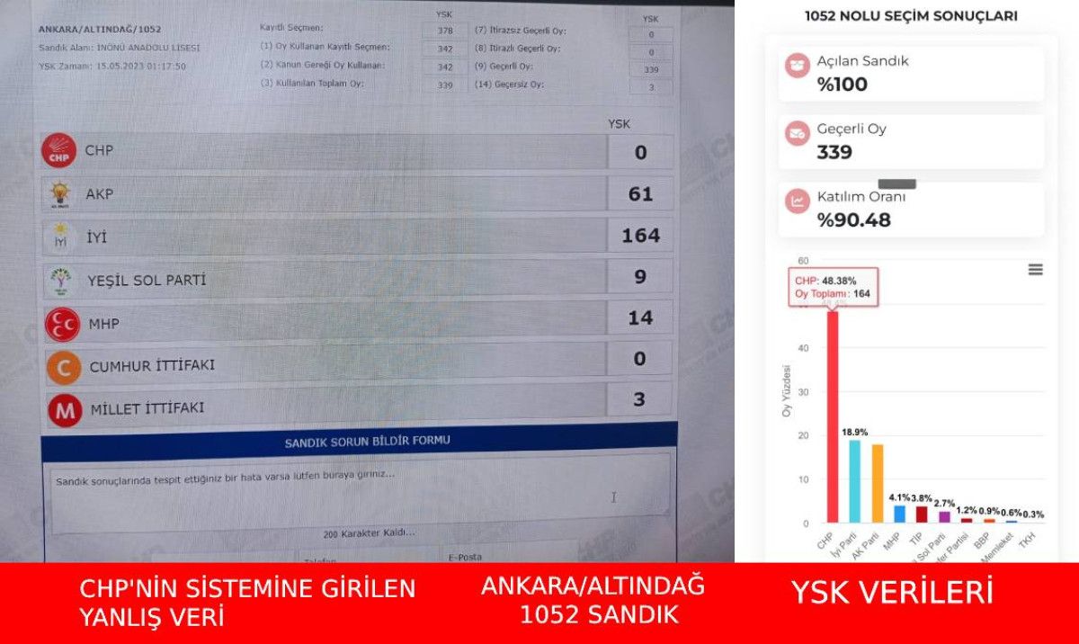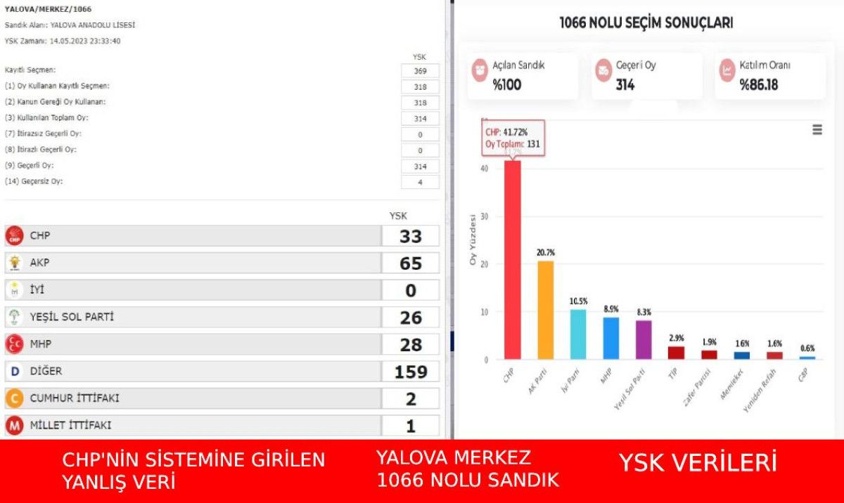 Paylaşımda ise "Bazı partilerin oyu sisteme "0" veya eksik olarak yüklendi" iddiası kamuoyunu provoke etmeye yönelik manipülasyondur. İddiaya konu görseller YSK değil, CHP'nin sistemine aittir. Tutanak ve YSK verileri doğruyken, bu veriler CHP sistemine yanlış girilmiştir." ifadeleri kullanıldı.