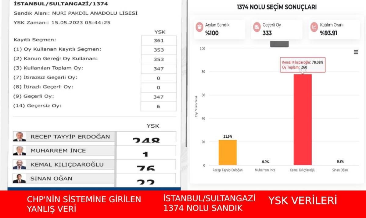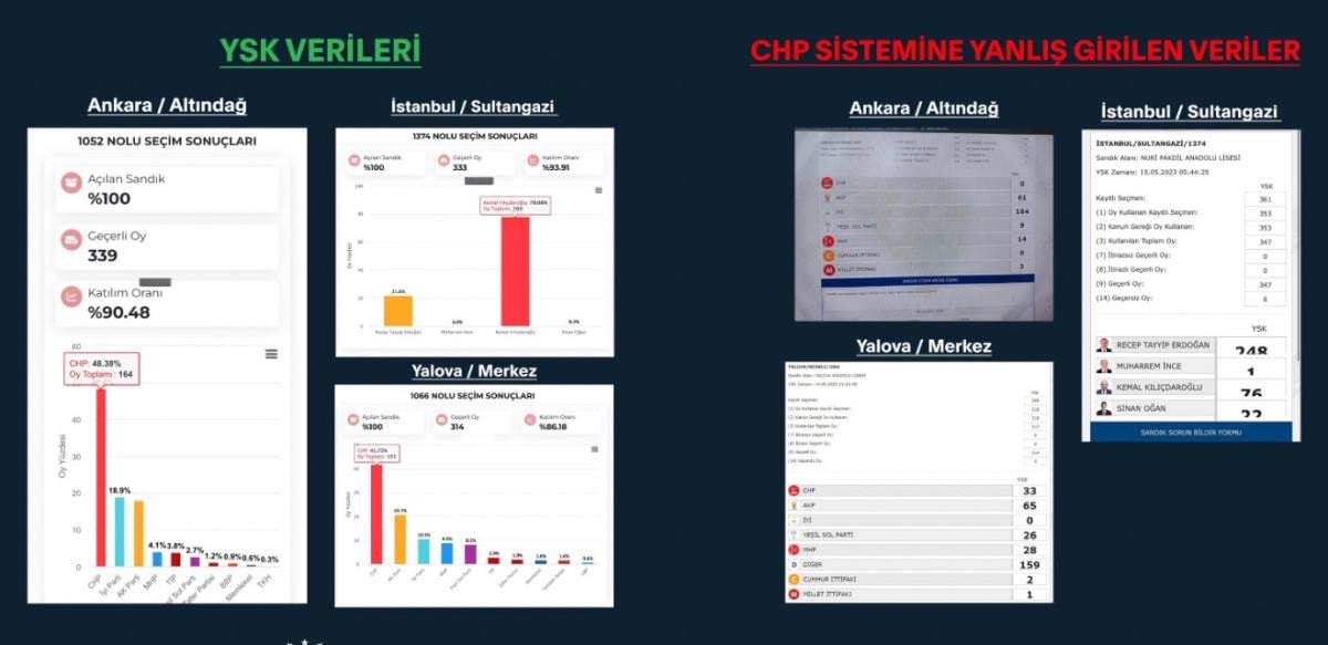 Muhalif hesaplardan paylaşıman görüntülerin YSK'ya ait değil, CHP'nin sistemine ait olduğu belirtilen açıklama ile birlikte doğru ve yanlış verilerin gösterildiği görseller de paylaşıldı.
