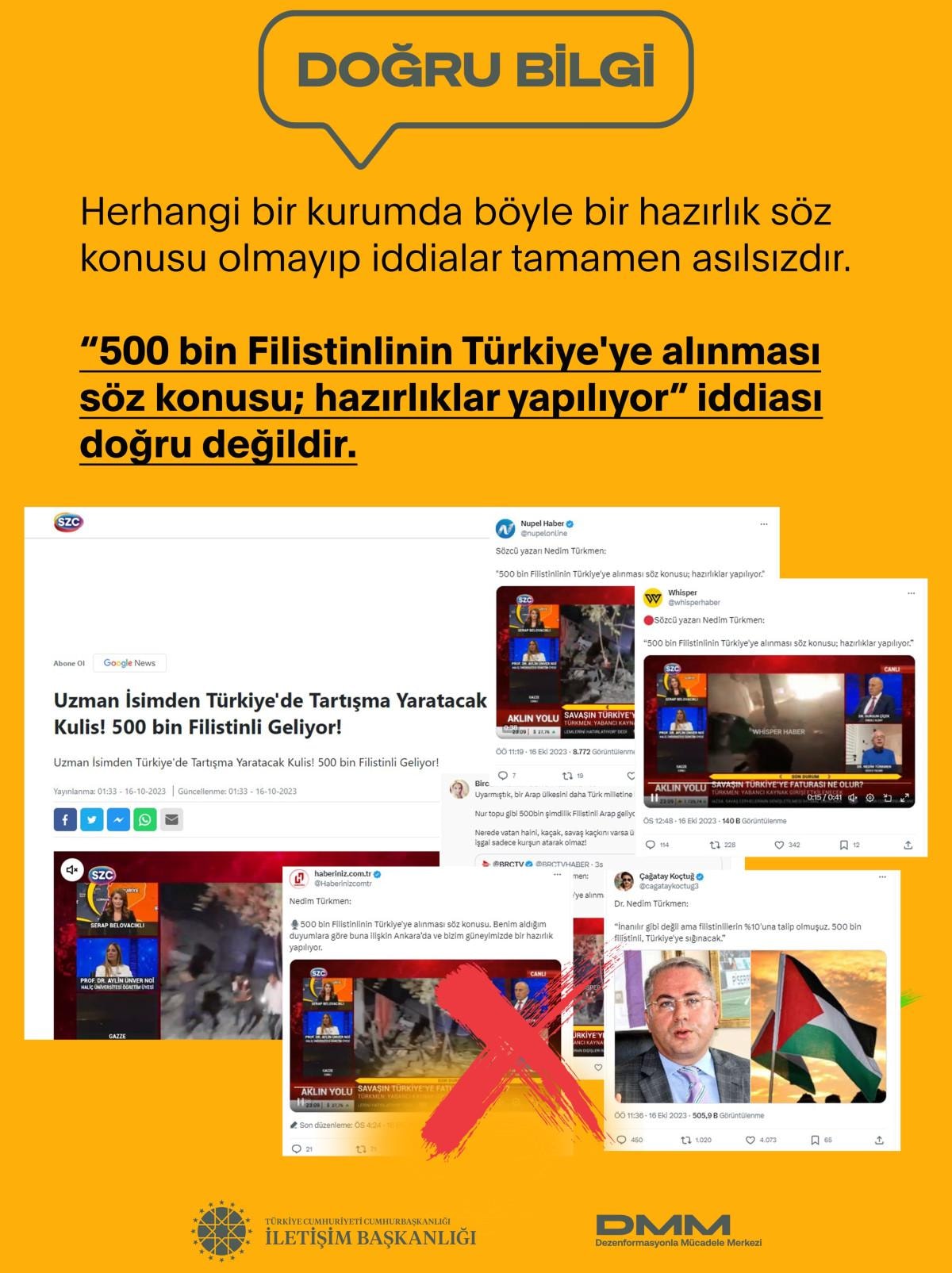 Bazı basın yayın organları ve sosyal medya hesaplarındaki, "500 bin Filistinlinin Türkiye'ye alınması söz konusu, hazırlıklar yapılıyor" iddiasına ilişkin Cumhurbaşkanlığı İletişim Başkanlığı Dezenformasyonla Mücadele Merkezi'nden açıklama geldi.
