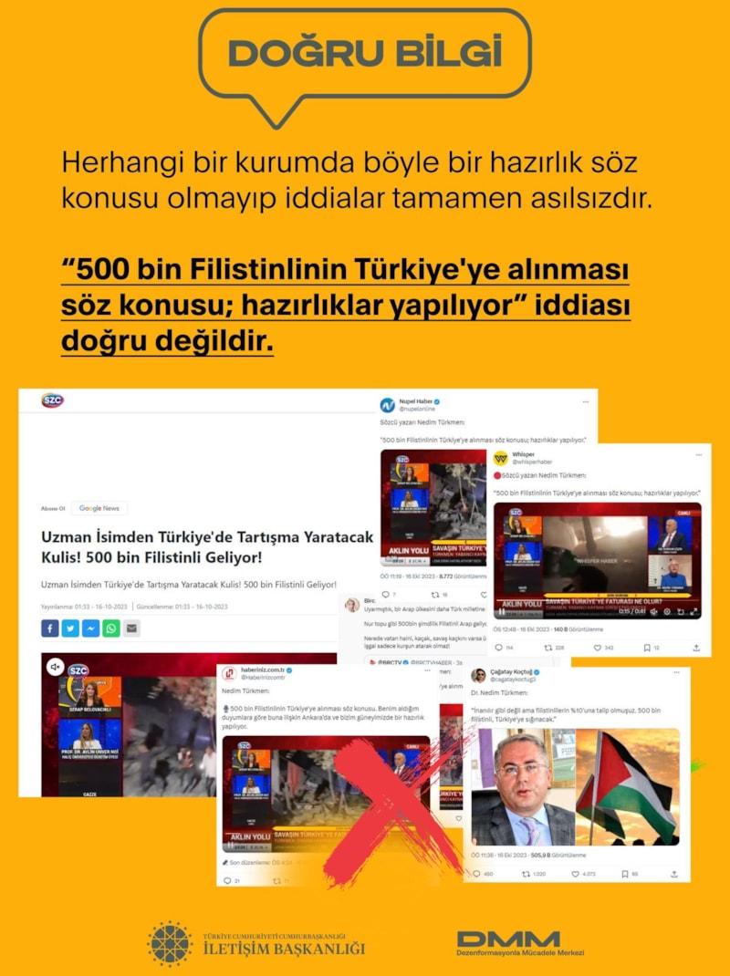 Cumhurbaşkanlığı İletişim Başkanlığı Dezenformasyonla Mücadele Merkezi'nden yapılan açıklamada 500 bin Filistinlinin Türkiye'ye alınacağı iddiasının doğru olmadığı belirtildi.