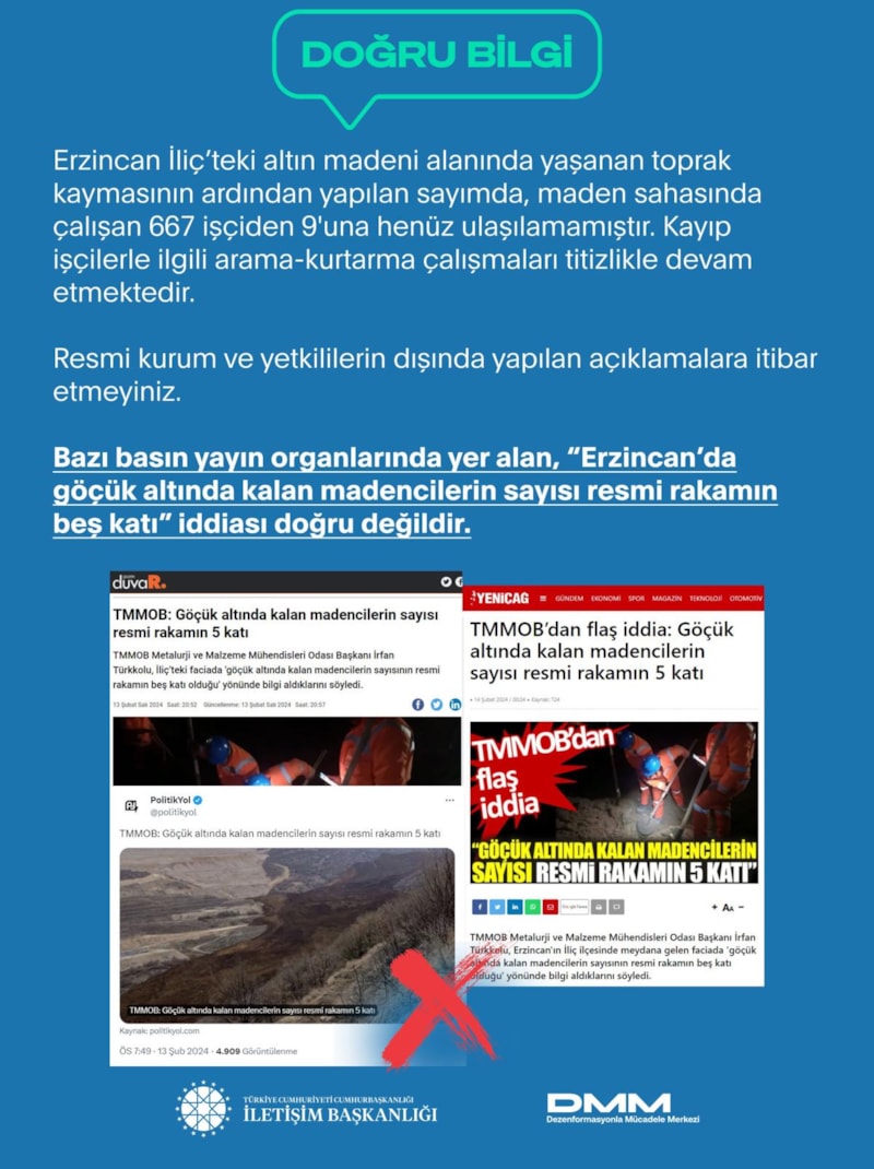 Dezenformasyonla Mücadele Merkezi, bazı basın yayın organlarında yer alan "Erzincan'da göçük altında kalan madencilerin sayısı resmi rakamın beş katı" iddiasının doğru olmadığını bildirdi.