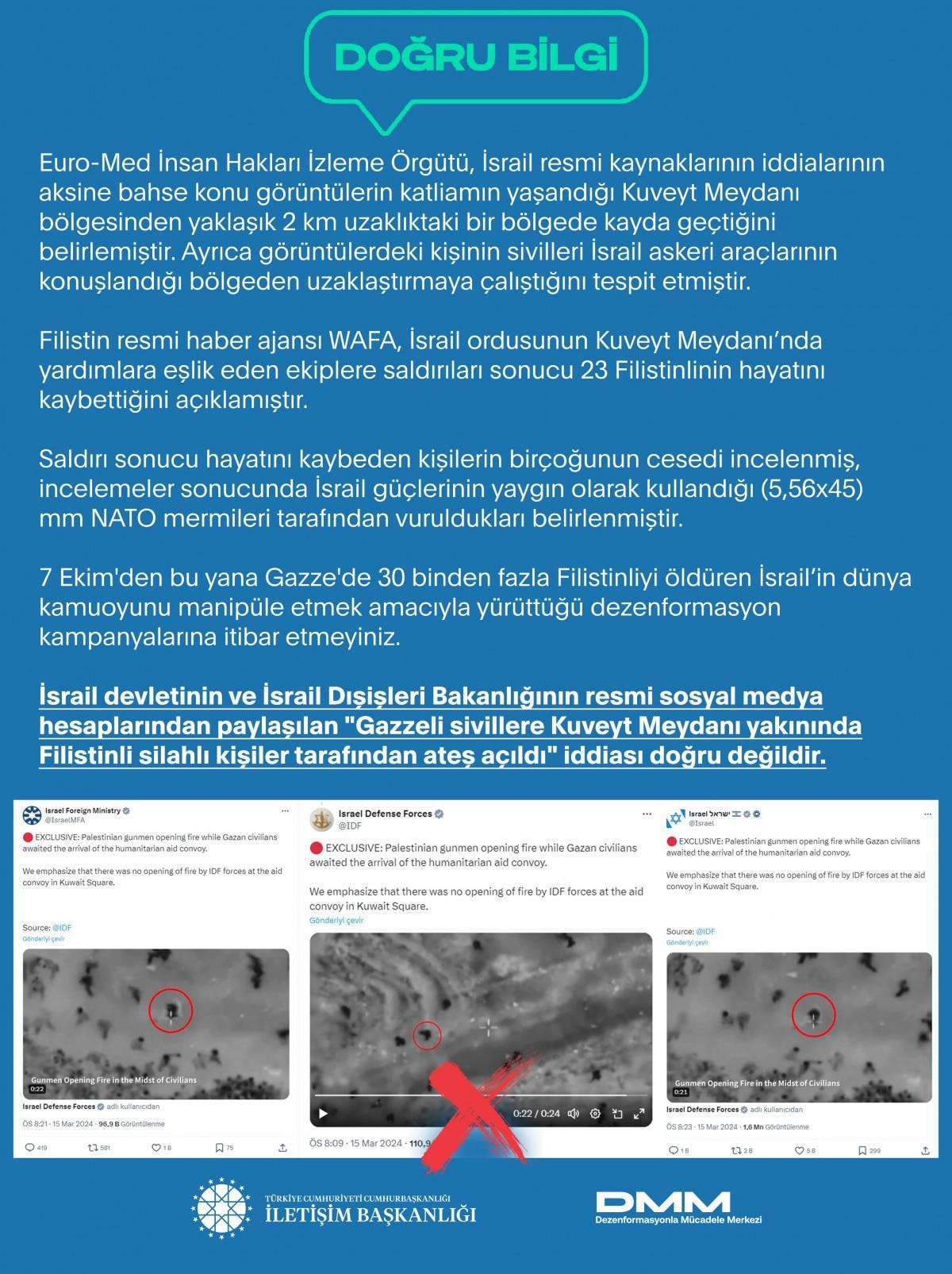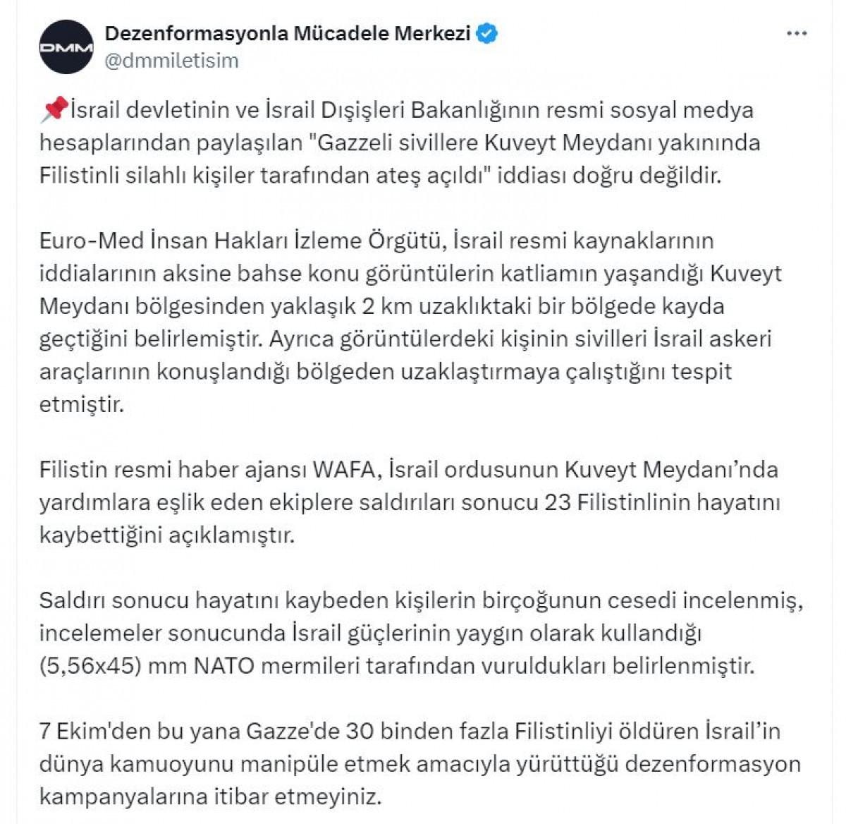 Açıklamada ayrıca, "Filistin resmi haber ajansı WAFA, İsrail ordusunun Kuveyt Meydanı'nda yardımlara eşlik eden ekiplere saldırıları sonucu 23 Filistinlinin hayatını kaybettiğini açıklamıştır. Saldırı sonucu hayatını kaybeden kişilerin birçoğunun cesedi incelenmiş, incelemeler sonucunda İsrail güçlerinin yaygın olarak kullandığı (5,56x45) mm NATO mermileri tarafından vuruldukları belirlenmiştir. 7 Ekim'den bu yana Gazze'de 30 binden fazla Filistinliyi öldüren İsrail'in dünya kamuoyunu manipüle etmek amacıyla yürüttüğü dezenformasyon kampanyalarına itibar etmeyiniz." ifadelerine yer verildi.